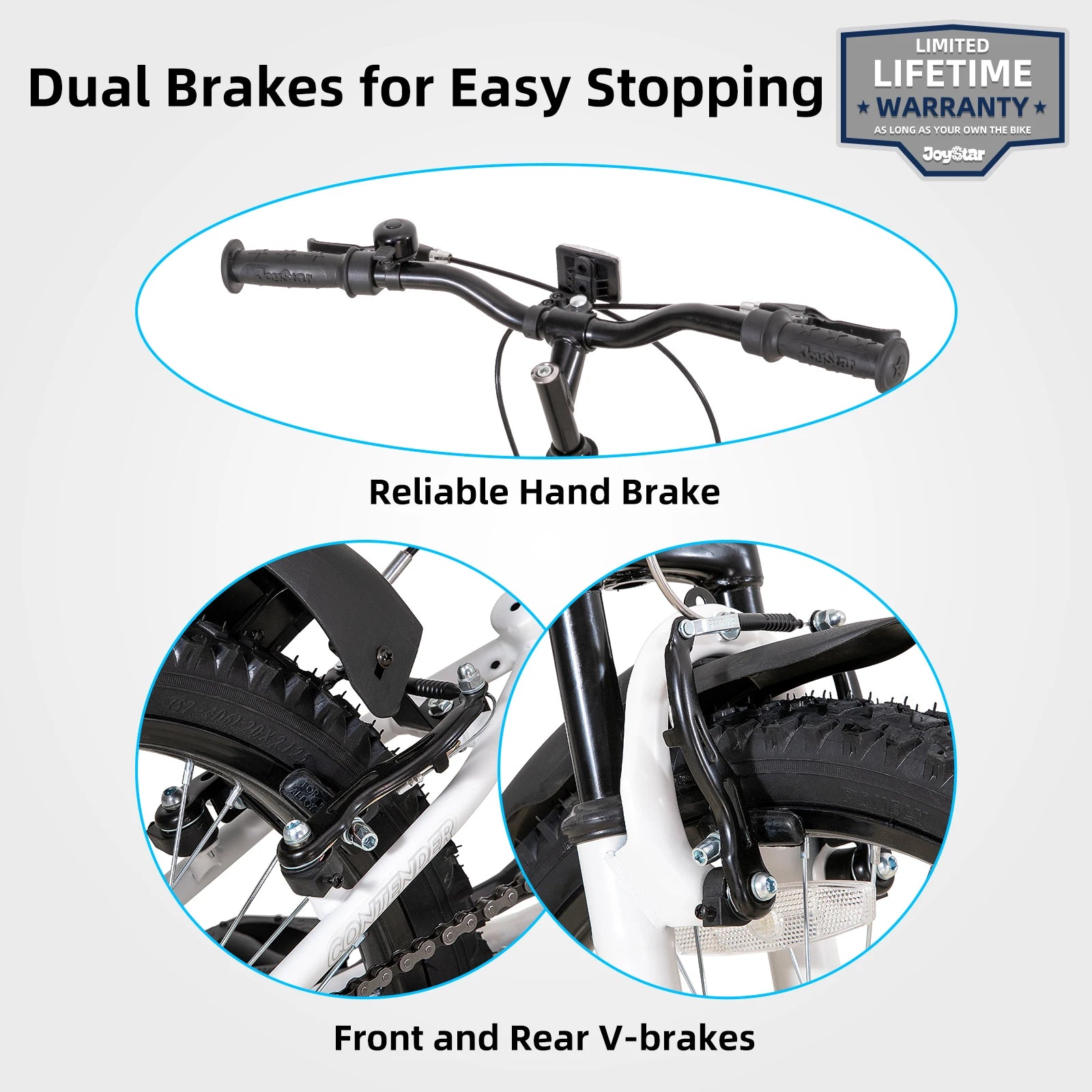 Front & Rear Linear Pull BrakeDual Handbrake provides precision speed control, offering double safety protection. | Ergonomic Comfortable SeatBike seat was designed to give your kids the most COMFORTABLE and SAFE ride as well as the best riding experience ever. | Handlebars and StemCome with singlespeed, easy for the little one to manipulate the bike, while the Hi-Ten steel handlebar and fork are joined by a 60mm stem for maximum steering performance. |