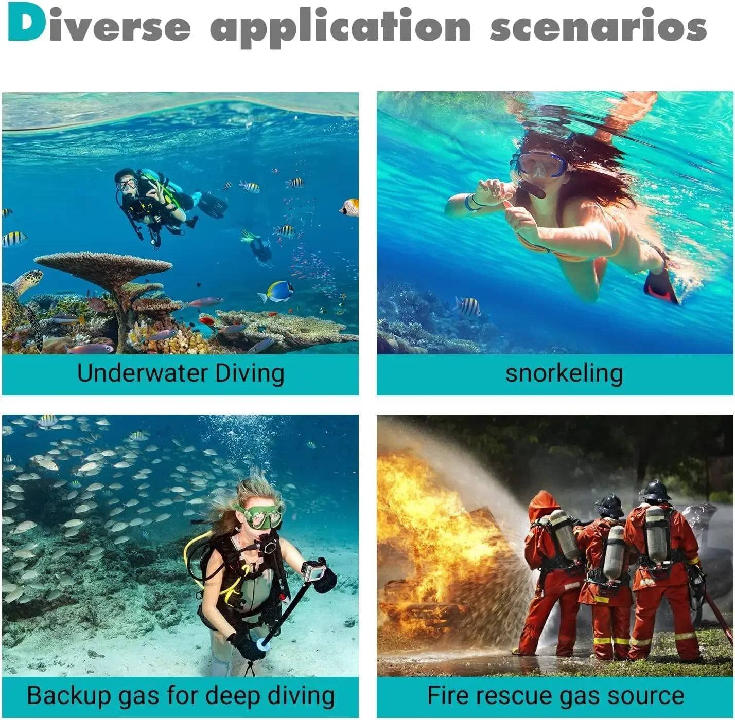 | 3 Types of Inflation You can use the high-pressure cylinder (not included) to inflate or use the scuba conversion head, or electric inflatable pump (not included) to inflate, making your diving sports preparation more convenient. | Easy to Carry and Store This is a mini scuba tank that weighs only 5.51lbs and it can be taken on a plane, you can put it in your handbag to dive anywhere. |