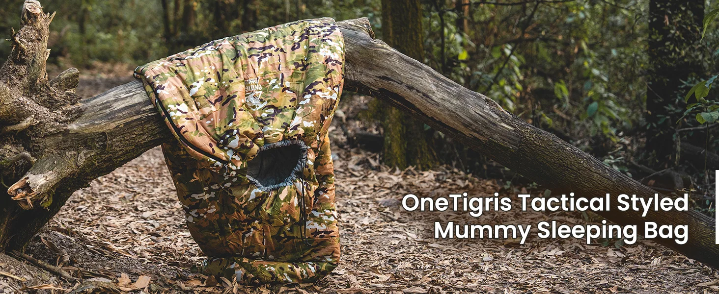 - OneTigris 3-season mummy sleeping bag, camo finish, designed for adult users