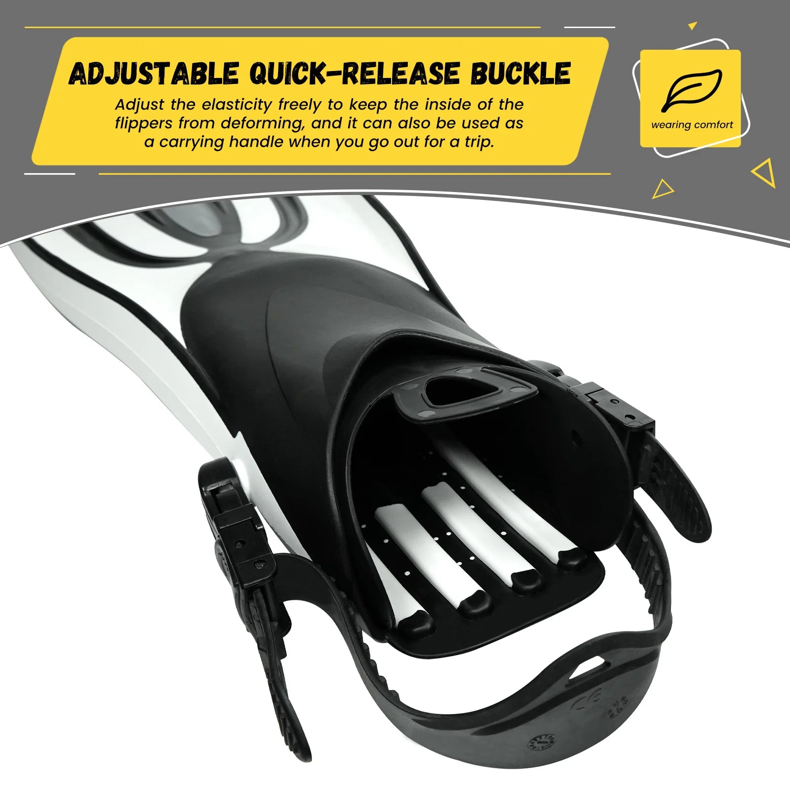 - Hydrodynamic Fins: Long fins feature a high-tenacity keel and diversion grooves to boost your efficiency, reduce drag, and offer stable, effortless movement toward the seabed.
